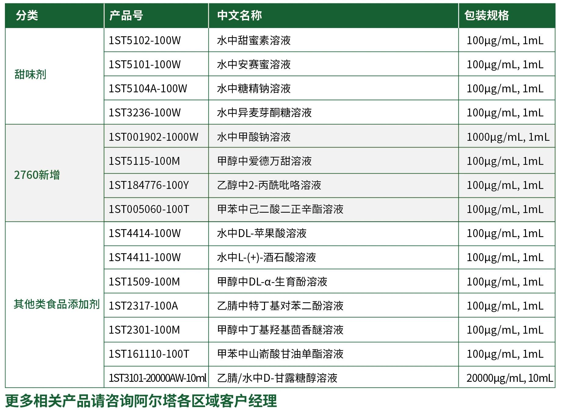 阿爾塔科技作為CNAS認可的國產(chǎn)標準物質(zhì)生產(chǎn)者,結(jié)合國家及行業(yè)相關(guān)檢測標準,推出食品添加劑檢測標準物質(zhì)解決方案,為保障食品安全提供技術(shù)支撐,推動食品工業(yè)的持續(xù)發(fā)展。