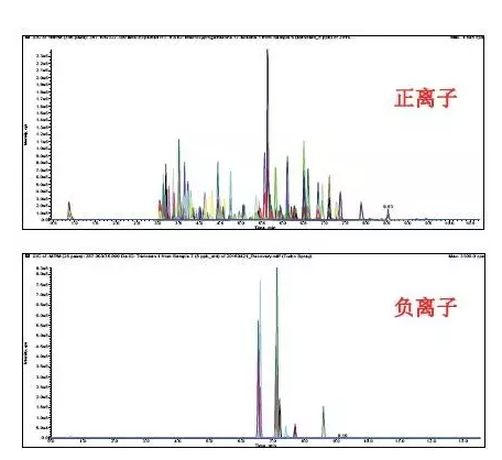 質(zhì)譜采用電噴霧(ESI)正負(fù)離子化、MRM采集方式 ,同一液相色譜方法,LC-MS/MS分析時(shí)間為13.5 min。