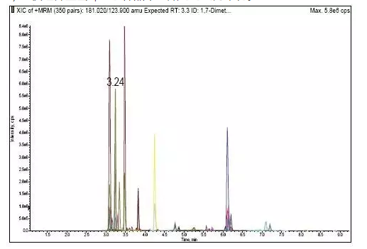 圖1. 176種濃度為5 ng/mL的PPCPs標(biāo)準(zhǔn)品色譜圖。
