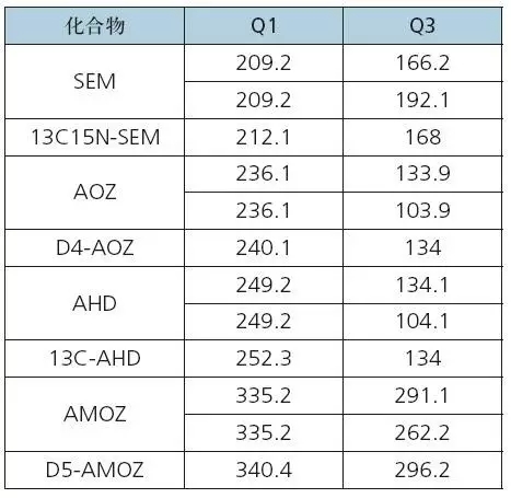 通常建立液質(zhì)聯(lián)用(LC-MS/MS)方法時需要使用標準品進行MRM質(zhì)譜方法優(yōu)化,包括母離子、子離子以及相應(yīng)的電壓參數(shù),費錢、費時、費力。本方法針對農(nóng)業(yè)部783號公告-1-2006中硝基呋喃代謝物及其內(nèi)標,建立了MRM離子對信息、質(zhì)譜參數(shù)、液相條件,省去了優(yōu)化步驟,可直接用于水產(chǎn)品中硝基呋喃代謝物殘留量的測定。