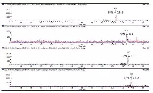 上述方法可完全適用于農(nóng)業(yè)部783號公告-1-2006《水產(chǎn)品中硝基呋喃類代謝產(chǎn)物殘留量的測定液相色譜-串聯(lián)質(zhì)譜法》,該法適合Sciex公司Triple Quad? 3200系列、3500系列、4000系列、4500系列、API 5000、5500系列以及6500系列的LC-MS/MS系統(tǒng)。靈敏度高,重現(xiàn)性好,適用于各相關(guān)實驗室進行該類物質(zhì)的日常分析。