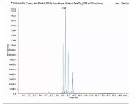 同時(shí)檢測(cè)蜂王漿中4中四環(huán)素類(lèi)抗生素總離子流色譜圖: